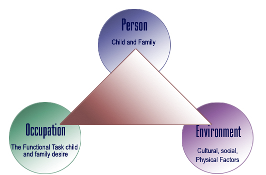 The occupational therapist assesses and considers factors within the child, the environment, and occupation to determine what changes or adaptations are needed in any of these arenas to improve the desired occupational performance and success.